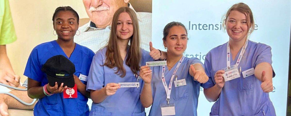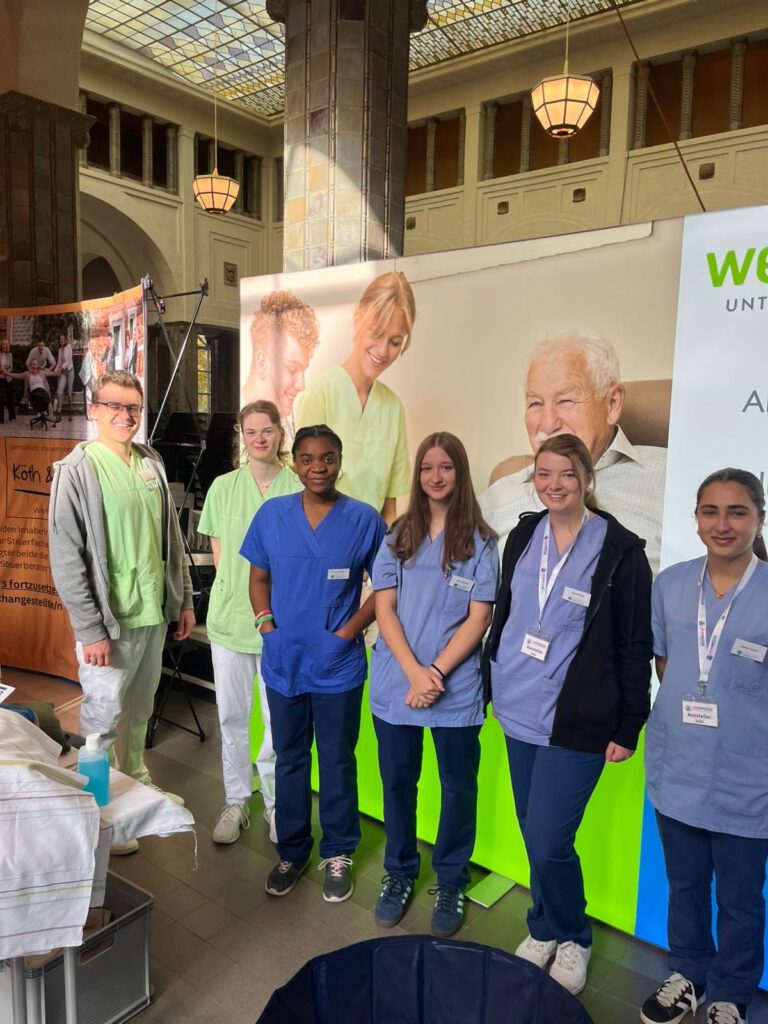 An unserem Stand herrschte durchgehend reger Austausch. Viele Interessierte nutzten die Gelegenheit, sich über Ausbildung, Berufseinstieg und Karrierechancen in der Pflege zu informieren. Auf einem großen Bildschirm präsentierten wir eine PowerPoint mit spannenden Einblicken in unseren Unternehmensverbund und den Pflegeberuf, während unsere Auszubildenden mit großer Offenheit und Begeisterung auf die Messegäste zugingen.