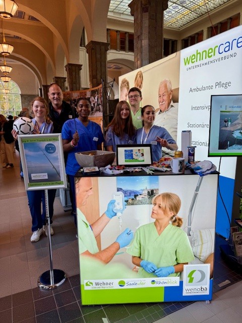 Am vergangenen Wochenende war wehnercare gemeinsam mit Michael Wehner, Nils Roßmann (Pflegedienstleitung), Lea Hetzel (Pflegefachkraft und Praxisanleiterin) und fünf engagierten Auszubildenden auf der Jobmesse in Bad Kissingen vertreten. Unter dem Motto „Catch & Care – Finde deinen Traumjob in der Pflege!“ luden wir Besucherinnen und Besucher zu unserem Angelspiel ein – ein echter Publikumsmagnet! Auch beim „Ball in den Sack“-Spiel war Geschick gefragt, und die Freude am Mitmachen stand den Gästen ins Gesicht geschrieben.